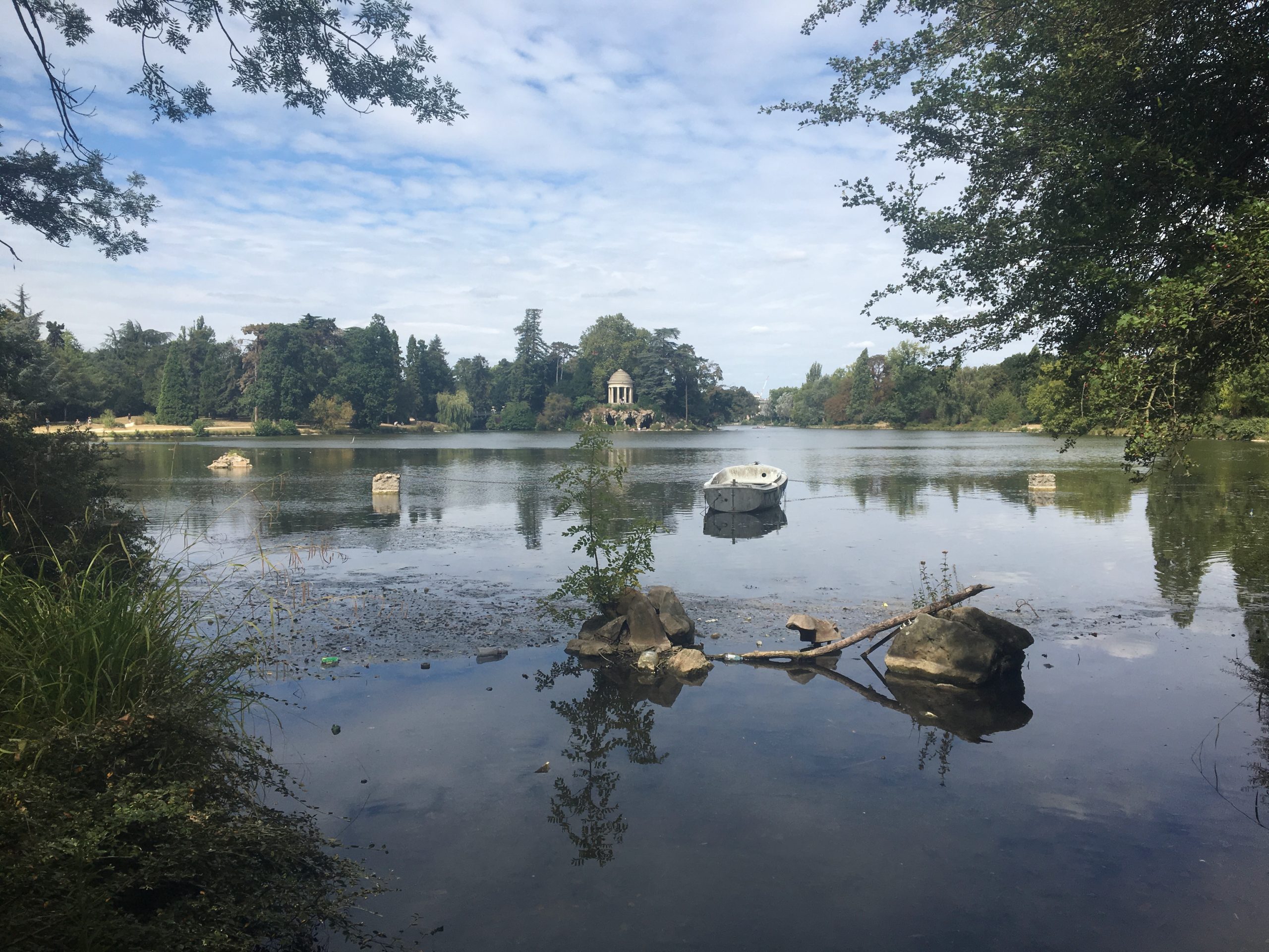 Marche à partir de 16h20 vers le lac Daumesnil – Une chaleur de plomb et un soleil implacable. Pourtant ces courant d’air ténus moqueurs qui entraînent des feuilles mortes, les plus petites, dans des courses tourbillonnantes au ras du sol. La radio africaine au bord de l’eau qui s’enlace à des voix vivantes, africaines aussi, qui viennent d’un bosquet dont l’ombre est le refuge d’une famille de canard. Un roulement de gravier que remuerait doucement la mer, il sort de la bouche d’une sri-lankaise, pour se glisser avec amour, semble-il, dans son téléphone. La course toujours déçue du petit chien à tête de chauve-souris, que les oies et les cygnes fuient, avec qui il aimerait tant jouer. La risée soudain qui plisse l’eau et emporte les barques endormies où, malgré toutes les injonctions, c’est un homme, encore, qui tient les rames. L’oiseau dont le vol perpendiculaire racle les cailloux du chemin sur l’ile de Reuilly. La pelouse grillée par l’été d’où jaillissent les grands arbres dont le roux gagne les feuilles par leur bord, et, au milieu, royal, allongé sur sa serviette comme l’odalisque, un quinquagénaire chauve et torse nu. Un pré-ado qui reprend avec sa mère les jeux de sa jeunesse tendre et fait siffler d’un mouvement sec du poignet une branche de saule « maman regarde je fais mal à l’air ! » – Le bruit de succion émue de la rame sortant de l’eau, puis un arpège de notes claires : les gouttes qui glissent de la pelle et retournent au lac. Les femmes, toutes belles, qu’on suit du coin de l’œil et qu’on quitte, vite, pour ne pas peser. Et même les hommes, dont on trouve que certains sont gracieux. Assises sur 2 bancs alignés à la limite de la porte dorée, 8 femmes, âgées, chantant les louange d’une amie dont la vie fut difficile, chœur de drame très antique ; l’une a les mêmes sourcils que ma grand-mère, dessinés trop haut sur un visage très fardé, et un regard qui s’égare, longtemps, sur le mien ; une autre, port orgueilleux comme si elle voulait marquer que, tout de même, elle vaut plus haut que ses compagnes ; le turban orange autour de son chignon lui fait tiare de reine, au-dessus d’un regard oriental qu’à peine masquent des lunettes teintées ; à l’aller elles parlent parlent et, plus tard, quand je repasserai devant elles, se débanderont avec des au-revoirs vouvoyés, comme des hirondelles quittent leur fil. La gloriette, au-dessus de la grotte, vue, au loin, depuis le fond du lac où une barque blanche repose entre deux plots de pierres, et la ligne des grands arbres verts dont elle est l’avant-poste, et le vaste ciel au-dessus laissant pressentir, derrière l’image, un espace immense et les vents du large ; on sait pourtant qu’ils n’y sont pas, ou alors tellement plus loin.